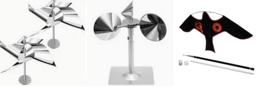 Reflekterande band, fågelskrämmor och roterande enheter som rör sig i vinden skapar osäkerhet för fåglar och får dem att undvika platsen.